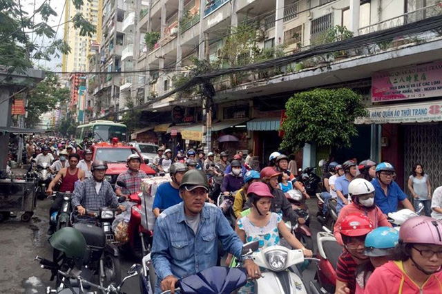 Vụ cháy khiến tuyến đường Nguyễn Trãi kẹt xe nghiêm trọng. Ảnh: Lê Trai.